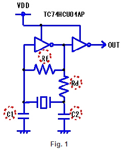 在振蕩電路的設(shè)計(jì),它認(rèn)識(shí)到各個(gè)組件的作用是必要的.表1中描述的角色了,作為一個(gè)例子,一個(gè)振蕩電路(圖1)使用一個(gè)通用的C-MOS IC(74年由東芝hcuo4ap).
