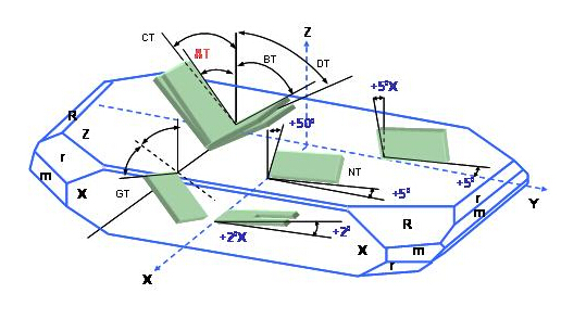 依據不同的應用領域及工作溫度需求, 因應了許多不同的石英切割角度種類. 例如AT-, BT-, CT-, DT-, NT, GT…..等不同的切割板片. 不同的切割方向的板片具有不同的彈性常數張量(elastic constant tensor), 不同的壓電常數張量(piezoelectric constant tensor)及不同的介電常數張量(dielectric constant tensor). 這些張量在石英組件的設計及應用上展現了不同的振蕩及溫度特性. (圖中)表現了在Z-plat石英結構上,幾種不同方向的石英板片切割方式.