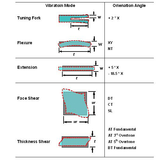 經(jīng)由不同的石英切割角度及不同電極型狀的電場效應(yīng), 石英芯片展現(xiàn)了各種不同的振動模態(tài). 以經(jīng)常產(chǎn)生的振動模態(tài)可以概分為擾曲模態(tài)(flexure mode), 伸縮模態(tài)(extension mode), 面剪切模態(tài)(face shear mode) 和 厚度剪切模態(tài)(thickness shear mode). 這幾種振動模態(tài)以簡單的方法在表一中可以看到. 在實(shí)際狀況中, 石英芯片并不是一定祇有單一種振動模態(tài), 而可能有多種模態(tài)同時存在在一個石英芯片的振蕩中, 經(jīng)由適當(dāng)?shù)脑O(shè)計, 可以壓制其它不希望產(chǎn)生的振動模態(tài)(unwanted mode), 來達(dá)到主要振動模態(tài)的最佳化.