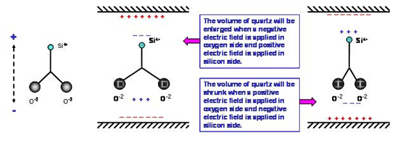 石英材料中的二氧化硅分子(SiO2) 在正常狀態(tài)下, 其電偶極是互相平衡的電中性. 在圖的二氧化硅是以二維空間的簡化圖形. 當我們在硅原子上方及氧原子下方分別給予正電場及負電場時, 空間系統(tǒng)為了維持電位平衡, 兩個氧原子會相互排斥, 在氧原子下方形成一個感應正電場區(qū)域, 同時在硅原子上方產生感應負電場區(qū)域. 相反的情況, 當我們在硅原子上方及氧原子下方分別給予負電場及正電場時, 兩個氧原子會相互靠近, 氧原子下方產生感應負電場,硅原子上方產生感應正電場. 然而, 氧原子的水平位置變化時, 鄰近的另一個氧原子會相對的產生排斥或吸引的力量, 迫使氧原子回到原來的空間位置. 因此, 電場的力量與原子之間的力量會相互牽動, 電場的改變與水平方向的形變是形成交互作用狀態(tài). 這個交互作用會形成一個在石英材料耗能最小的振動狀態(tài), 祇要由電場持續(xù)給與能量, 石英材料就會與電場之間維持一個共振的頻率. 這個壓電效應下氧原子的振幅與電場強度及電場對二氧化硅的向量角度有相對應的關系.在實際的應用上, 電場是由鍍在石英芯片上的金屬電極產生, 電場與二氧化硅的向量角度則是由石英晶棒的切割角度來決定.