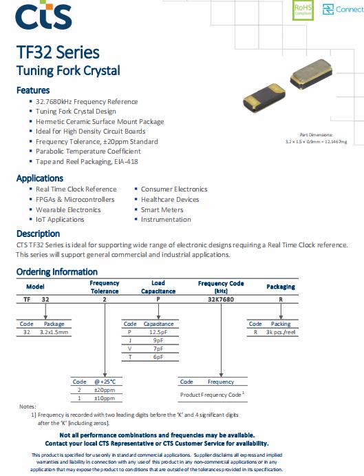 | TF322N32K7680R | CTS晶振 | TF32 | 32.768kHz | 0.126" L x 0.059" W (3.20mm x 1.50mm) |