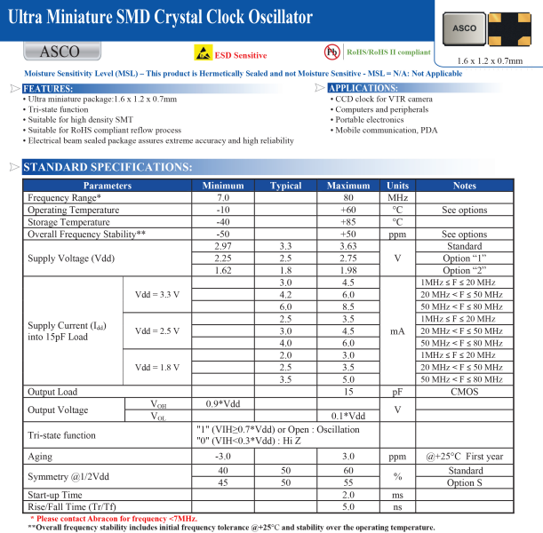 ABRACON晶振,ASCO-12.000MHZ-EK-T3晶振,ASCO晶振,有源晶體振蕩器.有源晶振,是只晶體本身起振需要外部電壓供應(yīng),起振后可直接驅(qū)動(dòng)CMOS 集成電路,產(chǎn)品本身已實(shí)現(xiàn)與薄型IC(TSSOP封裝,TVSOP封裝)同樣的1mm厚度,斷開時(shí)的消費(fèi)電流是15 µA以下,編帶包裝方式可對應(yīng)自動(dòng)搭載及IR回流焊接(無鉛對應(yīng))產(chǎn)品有幾種電壓供選1.8V,2.5V,3V3.3V,5V,以應(yīng)對不同IC產(chǎn)品需要.