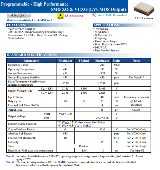 ABRACON晶振,ASG2-C晶振,壓控晶振.2520mm體積的晶振,可以說是目前小型數(shù)碼產(chǎn)品的福音,目前超小型的智能手機里面所應(yīng)用的就是小型的石英晶振,該產(chǎn)品最適用于無線通訊系統(tǒng),無線局域網(wǎng),已實現(xiàn)低相位噪聲,低電壓,低消費電流和高穩(wěn)定度,超小型,質(zhì)量輕等產(chǎn)品特點,產(chǎn)品本身編帶包裝方式,可對應(yīng)自動高速貼片機應(yīng)用,以及高溫回流焊接(產(chǎn)品無鉛對應(yīng)),為無鉛產(chǎn)品.