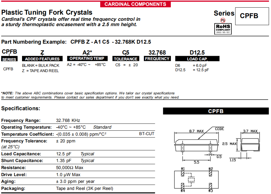 Cardinal晶振,CPFB晶振,石英晶體諧振器.32.768K系列具有超小型,薄型,質(zhì)地輕的表面貼片音叉型石英晶體諧振器,晶振產(chǎn)品本身具備優(yōu)良的耐熱性,耐環(huán)境特性,在辦公自動化,家電領(lǐng)域,移動通信領(lǐng)域可發(fā)揮優(yōu)良的電氣特性,符合無鉛標(biāo)準(zhǔn),滿足無鉛焊接的回流溫度曲線要求,金屬外殼的石英晶振使得產(chǎn)品在封裝時能發(fā)揮比陶瓷晶振外殼更好的耐沖擊性能.