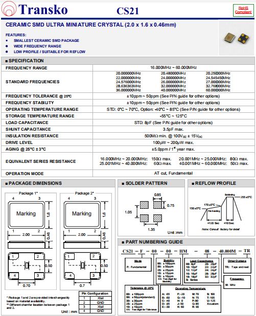 Transko晶振,CS21晶振,高性能石英晶體.貼片石英晶體,體積小,焊接可采用自動(dòng)貼片系統(tǒng),產(chǎn)品本身小型,表面貼片晶振,特別適用于有小型化要求的電子數(shù)碼產(chǎn)品市場(chǎng)領(lǐng)域,因產(chǎn)品小型,薄型優(yōu)勢(shì),耐環(huán)境特性,包括耐高溫,耐沖擊性等,在移動(dòng)通信領(lǐng)域得到了廣泛的應(yīng)用,晶振產(chǎn)品本身可發(fā)揮優(yōu)良的電氣特性,滿足無(wú)鉛焊接的高溫回流溫度曲線要求.