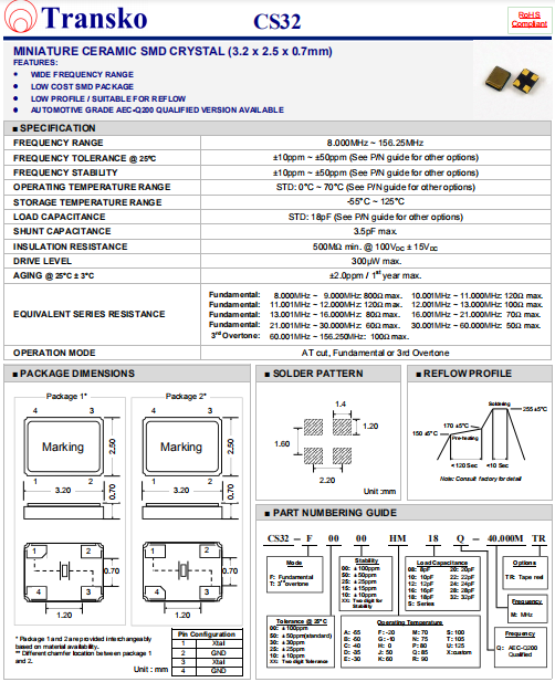 Transko晶振,CS32晶振,貼片無源晶體.貼片晶振本身體積小,超薄型石英晶體諧振器,特別適用于有目前高速發展的高端電子數碼產品,因為晶振本身小型化需求的市場領域,小型,薄型是對應陶瓷諧振器(偏差大)和普通的石英晶體諧振器(偏差?。┑闹虚g領域的一種性價比較出色的產品.產品廣泛用于筆記本電腦,無線電話,衛星導航HDD, SSD, USB, Blu-ray等用途,符合無鉛焊接的高溫回流焊曲線特性.