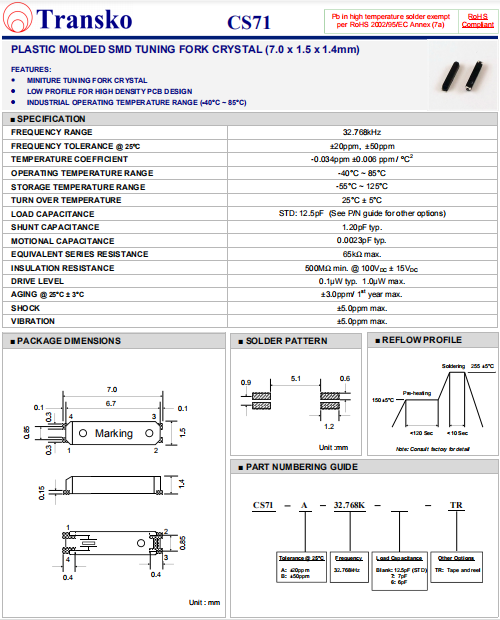 Transko晶振,CS71晶振,音叉水晶振子.小型貼片石英晶振,外觀尺寸具有薄型表面貼片型石英晶體諧振器,特別適用于有小型化要求的市場領域,比如智能手機,無線藍牙,平板電腦等電子數碼產品.晶振本身超小型,薄型,重量輕,晶體具有優良的耐環境特性,如耐熱性,耐沖擊性,在辦公自動化,家電相關電器領域及Bluetooth,Wireless LAN等短距離無線通信領域可發揮優良的電氣特性,滿足無鉛焊接的回流溫度曲線要求.