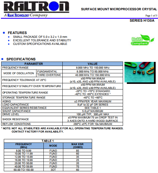 Raltron晶振,H130A晶振,石英晶體諧振器.小型石英貼片5032晶振,外觀尺寸具有薄型表面貼片型石英晶體諧振器,特別適用于有小型化要求的市場領域,比如智能手機,無線藍牙,平板電腦等電子數(shù)碼產(chǎn)品.晶振本身超小型,薄型,重量輕,晶體具有優(yōu)良的耐環(huán)境特性,如耐熱性,耐沖擊性,在辦公自動化,家電相關電器領域及Bluetooth,WirelessLAN等短距離無線通信領域可發(fā)揮優(yōu)良的電氣特性,滿足無鉛焊接的回流溫度曲線要求.