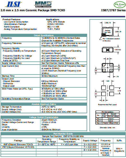 ILSI晶振,I787晶振,VC-TCXO晶振.具有最適合于移動通信設備用途的高穩定的頻率溫度特性.為對應低電源電壓的產品.(可對應DC +1.8 V±0.1 V to +3.2 V±0.1 V )高度:最高1.0 mm,體積:0.007 cm3,重量:0.024g,超小型,輕型.低消耗電流,表面貼片型產品.(可對應回流焊) 無鉛產品.滿足無鉛焊接的回流溫度曲線要求.