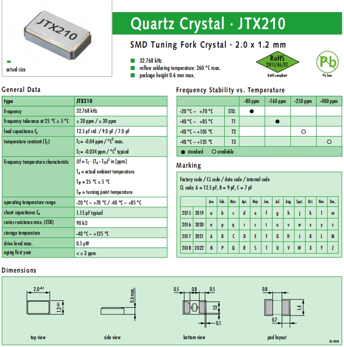 JAUCH晶振,JTX210晶振,石英晶體諧振器.32.768K系列具有超小型,薄型,質(zhì)地輕的表面貼片音叉型石英晶體諧振器,晶振產(chǎn)品本身具備優(yōu)良的耐熱性,耐環(huán)境特性,在辦公自動化,家電領(lǐng)域,移動通信領(lǐng)域可發(fā)揮優(yōu)良的電氣特性,符合無鉛標準,滿足無鉛焊接的回流溫度曲線要求,金屬外殼的石英晶振使得產(chǎn)品在封裝時能發(fā)揮比陶瓷晶振外殼更好的耐沖擊性能.