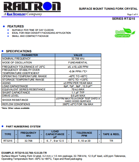 Raltron晶振,RT3215晶振,無源石英晶體.32.768K晶振.貼片晶振本身體積小,超薄型石英晶體諧振器,特別適用于有目前高速發(fā)展的高端電子數(shù)碼產(chǎn)品,因為石英晶振本身小型化需求的市場領(lǐng)域,小型,薄型是對應(yīng)陶瓷諧振器(偏差大)和普通的石英晶體諧振器(偏差小)的中間領(lǐng)域的一種性價比較出色的產(chǎn)品.產(chǎn)品廣泛用于筆記本電腦,無線電話,衛(wèi)星導(dǎo)航HDD,SSD,USB,Blu-ray等用途,符合無鉛焊接的高溫回流焊曲線特性.