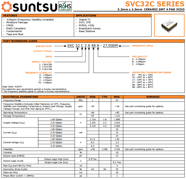 suntsu晶振,SVC32C晶振,壓控晶體振蕩器.貼片式石英晶體振蕩器,低電壓?jiǎn)?dòng)功率,并且有多種電壓供選擇,比如有1.8V,2.5V,3.3V,3.8V,5V等,產(chǎn)品被廣泛應(yīng)用于,平板筆記本,GPS系統(tǒng),光纖通道,千兆以太網(wǎng),串行ATA,串行連接SCSI,PCI-Express的SDH / SONET發(fā)射基站等領(lǐng)域.符合RoHS/無(wú)鉛.