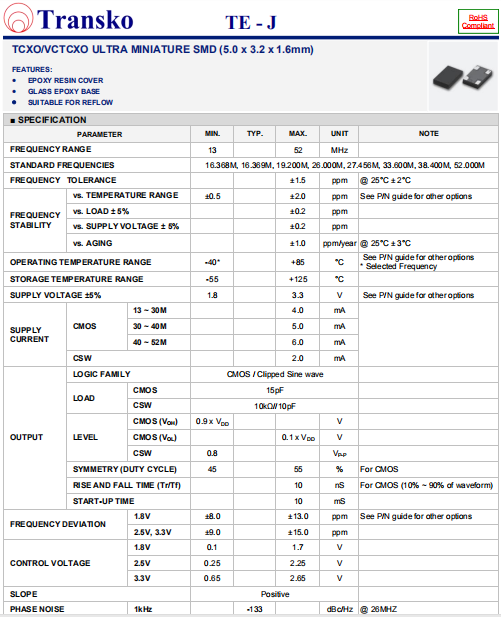 Transko晶振,TE-J晶振,壓控溫補(bǔ)晶體振蕩器.貼片式石英晶體振蕩器,低電壓啟動(dòng)功率,并且有多種電壓供選擇,比如有1.8V,2.5V,3.3V,3.8V,5V等,產(chǎn)品被廣泛應(yīng)用于,平板筆記本,GPS系統(tǒng),光纖通道,千兆以太網(wǎng),串行ATA,串行連接SCSI,PCI-Express的SDH / SONET發(fā)射基站等領(lǐng)域.符合RoHS/無鉛.