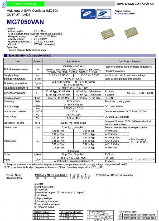 | X1M0004210003 | MG7050VAN | 156.250000 MHz | 7.00 x 5.00 x 1.60 mm | LVDS | 2.970 to 3.630 V |