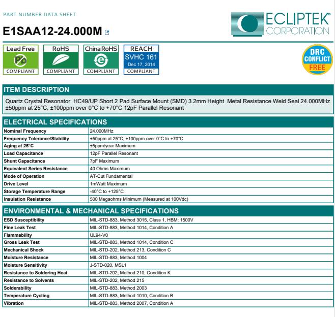 Ecliptek晶振將確保其振蕩器和石英晶體諧振器產品及相關設施滿足甚至超出國家的以及地方環保機構的相關法規規定及其他要求,同時該公司盡可能的參與并協助政府機關和其他官方組織從事的環保活動. 在地方對各項設施的管理責任中,確保滿足方針的目標指標,同時在各種經營與生產活動中完全遵守并符合現行所有標準規范的要求.ECLIPTEK晶振,E1S石英晶體諧振器,E1SAA12-24.000M晶振.