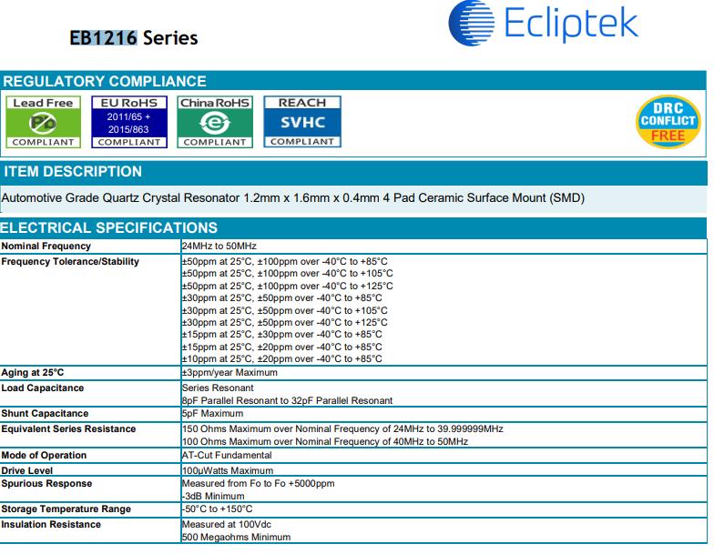 | EB1216YA10-24.576M TR | Ecliptek | EB1216 | MHz 晶體 | 24.576 MHz | ±50ppm | ±30ppm | 10pF |