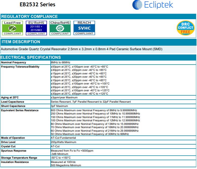 | EA2532QA18-14.7456M TR | ECLIPTEK晶振 | EA2532 | MHz 晶體 | 14.7456 MHz | ±20ppm | ±15ppm | 18pF |