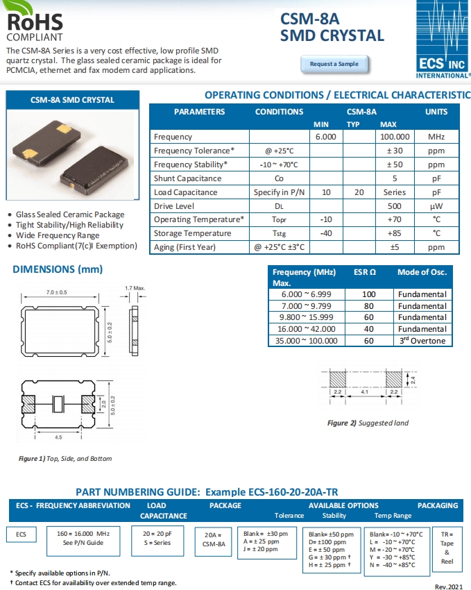 ECS-200-20-20A-TR\CSM-8A\20兆赫茲\7050mm\SMD晶體,尺寸7050mm,頻率為20MHZ,ECS晶振,美國(guó)伊西斯晶振,石英貼片晶振,進(jìn)口無(wú)源諧振器,SMD晶體,石英晶體,石英晶體諧振器,音叉晶體,高質(zhì)量晶振,低損耗晶振,7050mm貼片晶振,無(wú)線設(shè)備晶振,智能家居晶振,CSM-8A系列是一款非常具有成本效益的低規(guī)格貼片石英晶體。
