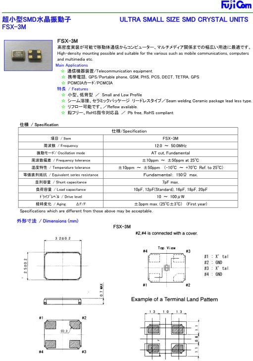 Fujicom晶振,FSX-3M四腳貼片晶振,SMD水晶振動子,超小型表面貼片型石英SMD晶振,最適合使用在汽車電子領(lǐng)域中,也是特別要求高可靠性的引擎控制用CPU的時鐘部分.低頻晶振可從7.98MHz起對應(yīng),小型,超薄型具備強(qiáng)防焊裂性,石英晶體在極端嚴(yán)酷的環(huán)境條件下也能發(fā)揮穩(wěn)定的起振特性,產(chǎn)品本身具有耐熱,耐振,耐撞擊等優(yōu)良的耐環(huán)境特性,滿足無鉛焊接以及高溫回流溫度曲線要求,符合AEC-Q200標(biāo)準(zhǔn).