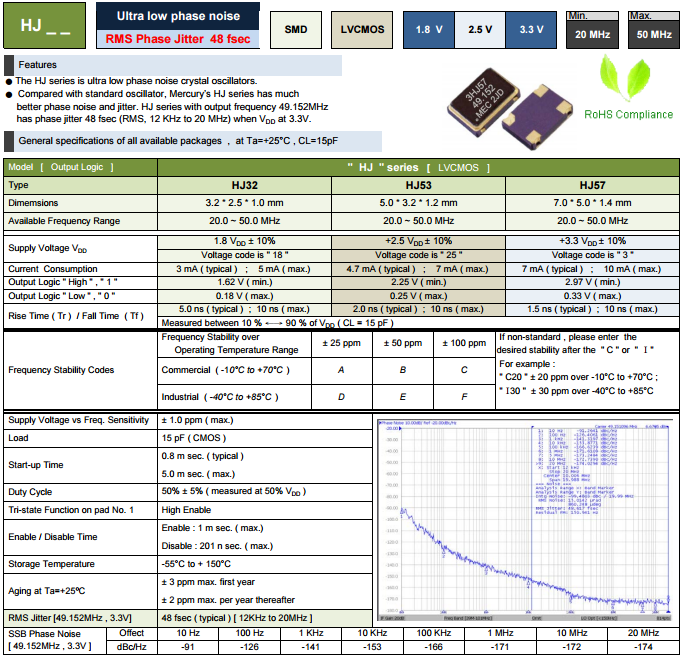 MERCURY晶振,貼片石英晶振,HJ53有源晶體.無論是溫補晶體也好,壓控晶振也罷,產品均采用了,離子刻蝕調頻技術,比目前一般使用的真空蒸鍍方式調頻,主要在產品參數有以下提升:1.微調后調整頻率能控制在±2ppm,一般只能保持在±5ppm;2.產品的激勵功率相關性參數有大幅提升;3.產品的長期老化率可保證在±2ppm之內.
