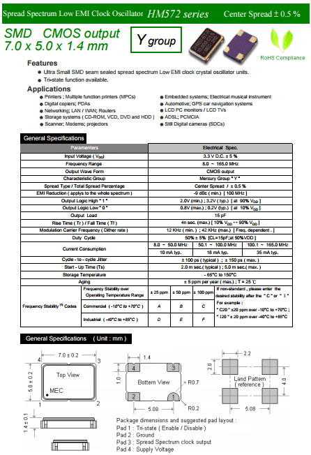 MERCURY晶振,瑪居禮振蕩器,HM572Y石英振蕩子.小型SMD有源晶振,從最初超大體積到現在的7050mm,有著翻天覆地的改變,體積的變小也試產品帶來了更高的穩定性能,接縫密封石英晶體振蕩器,精度高,覆蓋頻率范圍寬的特點,SMD高速自動安裝和高溫回流焊設計,Optionable待機輸出三態輸出功能,電源電壓范圍:1.8V?5 V,高穩定性,低抖動,低功耗,主要應用領域:無線通訊,高端智能手機,平板筆記本WLAN,藍牙,數碼相機,DSL和其他IT產品的晶振應用,三態功能,PC和LCDM等高端數碼領域,符合RoHS/無鉛.