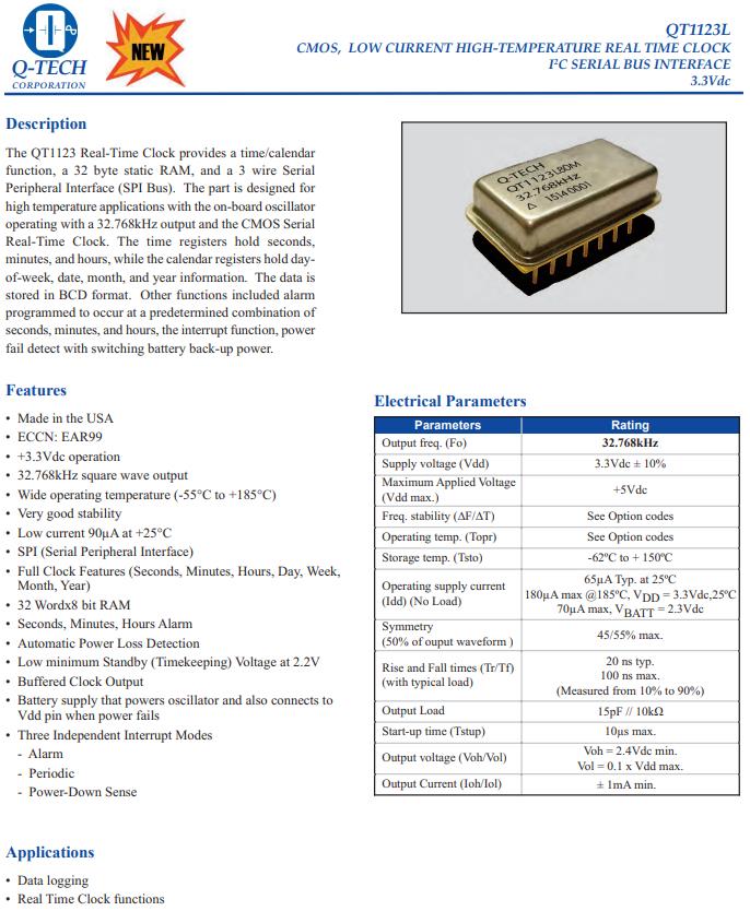 QT1123L88M-32.768kHz,實時時鐘應用晶振,32.768KHz進口晶振,Q-Tech晶振,QT1123L實時時鐘模塊,QT1123L88M-32.768kHz晶振,石英晶體,該器件設計用于板載振蕩器的高溫應用,采用32.768kHz輸出和CMOS串行實時時鐘,時間寄存器保存秒,分鐘和小時,而日歷寄存器保存星期、日期、月份和年份信息,數據是以BCD格式存儲,其他功能包括報警,被編程為在以下預定組合下發生 秒、分、小時、中斷功能、功率 通過切換電池備用電源進行故障檢測,實時時鐘應用晶振,數據記錄晶振.