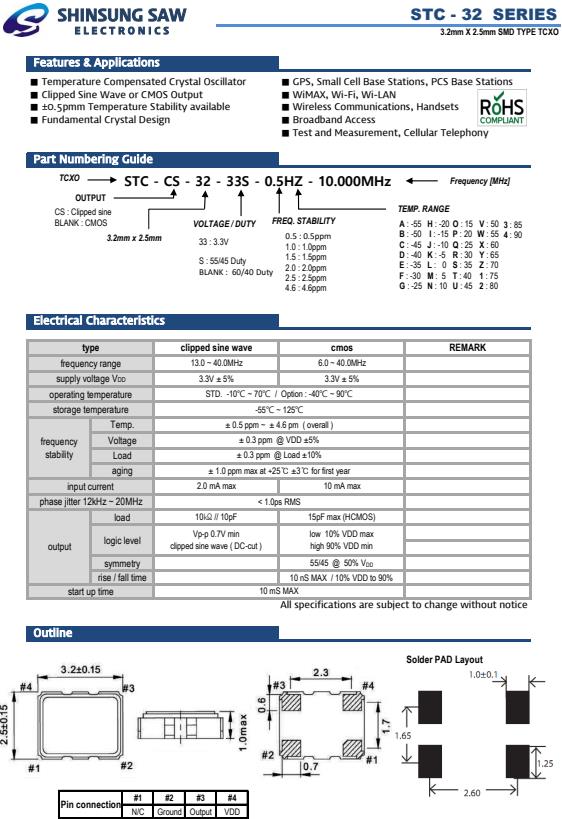 韓國(guó)新松晶振,STC-32溫度補(bǔ)償晶體振蕩器,STC-CS-32-33S-0.5HZ-16.000MHz晶振,小型SMD有源晶振,從最初超大體積到現(xiàn)在的7050mm,6035mm,5032mm,3225mm,2520mm體積,有著翻天覆地的改變,體積的變小也使產(chǎn)品帶來(lái)了更高的穩(wěn)定性能,接縫密封石英晶體振蕩器,精度高,覆蓋頻率范圍寬的特點(diǎn),SMD高速自動(dòng)安裝和高溫回流焊設(shè)計(jì),Optionable待機(jī)輸出三態(tài)輸出功能,電源電壓范圍:1.8V~5V,高穩(wěn)定性,低抖動(dòng),低功耗,主要應(yīng)用領(lǐng)域:無(wú)線通訊,高端智能手機(jī),平板筆記本W(wǎng)LAN,藍(lán)牙,數(shù)碼相機(jī),DSL和其他IT產(chǎn)品的晶振應(yīng)用,三態(tài)功能,PC和LCDM等高端數(shù)碼領(lǐng)域,符合RoHS/無(wú)鉛.