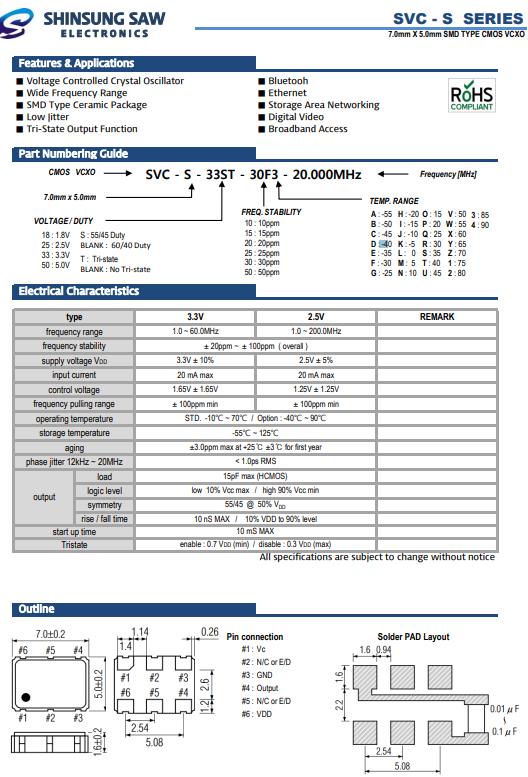 SHINSUNG進口晶振,SVC-S壓控晶體振蕩器,SVC-S-33ST-30F3-20.000MHz晶振,小型SMD有源晶振,從最初超大體積到現在的7050mm,6035mm,5032mm,3225mm,2520mm體積,有著翻天覆地的改變,體積的變小也使產品帶來了更高的穩定性能,接縫密封石英晶體振蕩器,精度高,覆蓋頻率范圍寬的特點,SMD高速自動安裝和高溫回流焊設計,Optionable待機輸出三態輸出功能,電源電壓范圍:1.8V~5V,高穩定性,低抖動,低功耗,主要應用領域:無線通訊,高端智能手機,平板筆記本WLAN,藍牙,數碼相機,DSL和其他IT產品的晶振應用,三態功能,PC和LCDM等高端數碼領域,符合RoHS/無鉛.