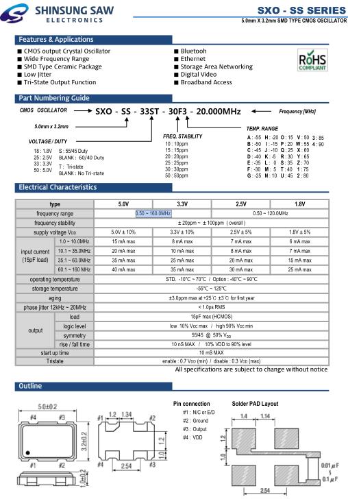 SHINSUNG低抖動晶振,SXO-SS通信設備晶振,SXO-SS-33ST-30F3-24.000MHz晶振,小型SMD有源晶振,從最初超大體積到現在的7050mm,6035mm,5032mm,3225mm,2520mm體積,有著翻天覆地的改變,體積的變小也使產品帶來了更高的穩定性能,接縫密封石英晶體振蕩器,精度高,覆蓋頻率范圍寬的特點,SMD高速自動安裝和高溫回流焊設計,Optionable待機輸出三態輸出功能,電源電壓范圍:1.8V~5V,高穩定性,低抖動,低功耗,主要應用領域:無線通訊,高端智能手機,平板筆記本WLAN,藍牙,數碼相機,DSL和其他IT產品的晶振應用,三態功能,PC和LCDM等高端數碼領域,符合RoHS/無鉛.