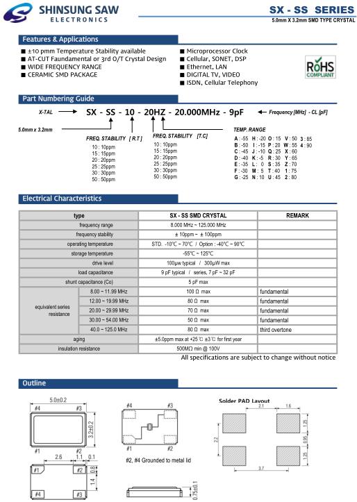 SHINSUNG晶振,SX-SS無源晶體,SX-SS-10-20HZ-16.000MHz-6pF晶振,SHINSUNG Crysta成立于1990年,并開始生產石英晶振,濾波器,石英晶體振蕩器,同時向客戶提供最新的新松貼片晶振或通孔型晶振單元,時鐘有源晶振,溫補晶振等晶振產品,一直以供應優(yōu)質晶振產品為信念,不斷給社會創(chuàng)造價值.