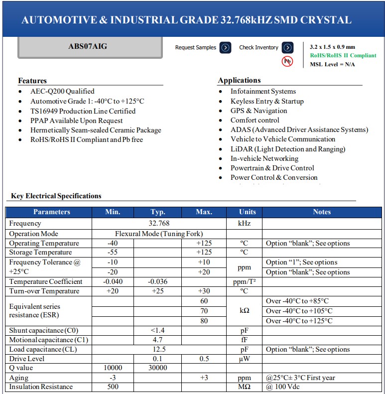 Abracon晶振ABS07AIG是一種高溫石英晶體,小體積尺寸3.2x1.5mm兩腳貼片晶振,32.768K晶振,石英晶體諧振器,通過(guò)AEC-Q200認(rèn)證,并通過(guò)TSI6949生產(chǎn)線認(rèn)證。該器件具有-40°C至+125°C的寬工作溫度范圍,是極端環(huán)境下商業(yè)或工業(yè)應(yīng)用的完美解決方案。憑借超薄的外形,無(wú)源晶振ABS07AIG可以在空間受限的設(shè)計(jì)中實(shí)現(xiàn),如可穿戴設(shè)備或車輛的信息娛樂(lè)系統(tǒng)。這種石英晶體采用密封的陶瓷封裝,在導(dǎo)航,智能手機(jī),無(wú)線通信,車載晶振等應(yīng)用中具有長(zhǎng)期可靠性。與其ABS07系列類似,automotive系列可以執(zhí)行低至10ppm的嚴(yán)格頻率穩(wěn)定度,以確保其時(shí)間管理精確無(wú)誤。雖然ABS07AIG系列可以執(zhí)行額外的要求,但它針對(duì)低功耗進(jìn)行了優(yōu)化,以延長(zhǎng)電池壽命,因此非常適合各種應(yīng)用。汽車導(dǎo)航專用石英晶體ABS07AIG-32.768KHZ-D-T