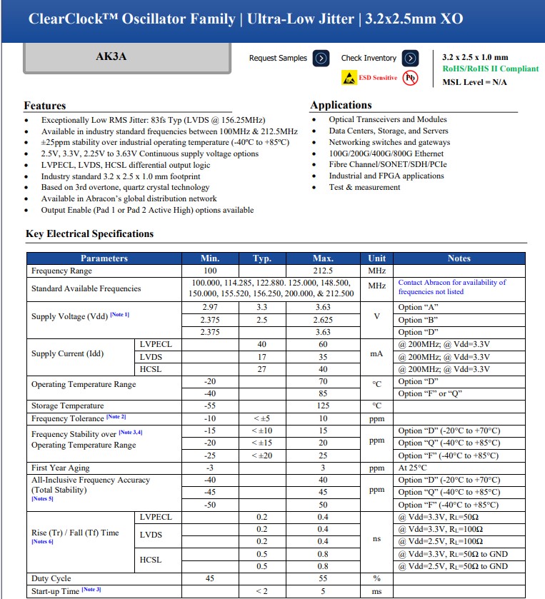 Abracon晶振AK3A是一款超低抖動(dòng)石英晶體振蕩器,旨在為數(shù)據(jù)中心、100G/400G/800G以太網(wǎng)和光模塊等高速應(yīng)用提供穩(wěn)定、精確的時(shí)鐘信號。該器件使用第三泛音技術(shù)來實(shí)現(xiàn)64fs抖動(dòng)性能和更低的功耗。作為我們的延伸ClearClock系列,非常適合需要100至212.5MHz載波頻率和400Gbps通道速率的應(yīng)用。AK3A有源石英晶振是緊湊型設(shè)計(jì)的完美解決方案,因?yàn)樗С?.2x2.5mm的行業(yè)標(biāo)準(zhǔn)尺寸,但與AK2和AX3系列相比,抖動(dòng)性能大幅提高。這些系列的振蕩器可在Abracon的全球分銷網(wǎng)絡(luò)中獲得,并提供各種輸出邏輯,如LVPECL、LVDS和HCSL。這些器件在提供可靠、高效振蕩的同時(shí),可以在-40°C至+85°C的工作溫度范圍內(nèi)保持25ppm的穩(wěn)定性,在-20°C至+70°C的工作溫度范圍內(nèi)保持15ppm的穩(wěn)定性。光學(xué)收發(fā)器和光模塊應(yīng)用晶振AK3APAF1-156.2500T3