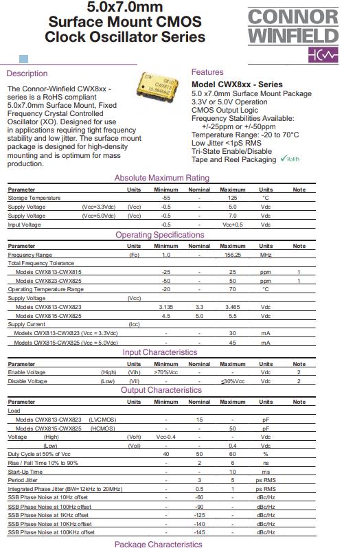 Connor-Winfield CWX8xx -該系列產(chǎn)品符合RoHS要求5.0x7.0mm表面安裝,固定晶體頻率控制時(shí)鐘晶體振蕩器(XO)。設(shè)計(jì)用于適用于頻率要求較緊的場合穩(wěn)定性好,抖動(dòng)小。表面安裝包裝為高密度設(shè)計(jì)安裝和是最佳質(zhì)量生產(chǎn)。