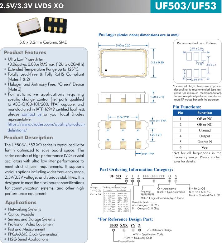UF503/UF53 XO系列是時鐘晶體振蕩器家庭優化節省板空間。系列由高性能LVDS晶體組成振蕩器具有超低抖動性能滿足嚴格的芯片組要求。它支持多種選擇,包括更寬的頻率范圍,2.5V/3.3V電壓,各種穩定性好。它是設計滿足時鐘源規格用于通信系統等高層設備性能。