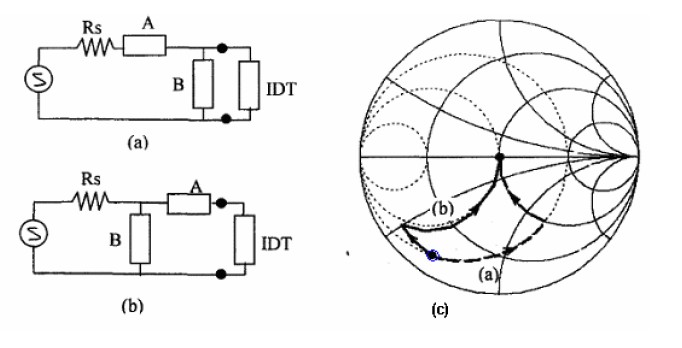 圖1 二種簡單匹配電路方案(a)、(b) 及對應的Smith圓圖路徑(c)匹配結構確定后,如何找到匹配元件值?一般有兩種方法:一是試驗法。借助于矢量網(wǎng)絡分析儀的Smith圓圖和頻響圖實際匹配。二是借助于矢量網(wǎng)絡分析儀,提取SAW濾波器的S參數(shù),計算濾波器的四端網(wǎng)絡導納Y參數(shù),通過軟件匹配計算匹配元件值,最后指導試驗匹配。 實際聲表面濾波器匹配時需要注意的問題: (1) 評估板和系統(tǒng)板上的匹配元件值有些差異,其原因是分布參數(shù)不同,需要微調(diào)元件值。 (2) 高損耗濾波器通常要求失配,以得到好的通帶特性。