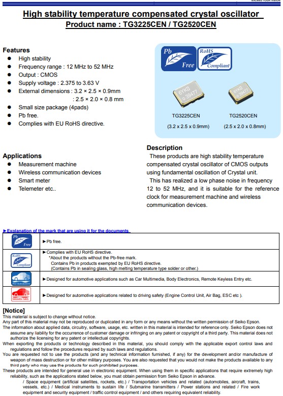 日本愛普生晶振TG2520CEN,是一款TCXO溫補晶振,小體積晶振尺寸2.5x2.0mm有源晶振,四腳貼片晶振,石英晶體振蕩器,電源電壓2.375V至3.63V,具有高穩(wěn)定溫度CMOS輸出的補償晶體振蕩器,超小型,輕薄型,低抖動,低功耗,低損耗,低耗能,低電源電壓,高穩(wěn)定性等特點,利用晶體單元的基本振蕩。這實現(xiàn)了頻率中的低相位噪聲12MHz至52MHz,適合用作基準(zhǔn)電壓源,無線通信設(shè)備,智能電表,遙測儀,測量機器和無線的時鐘通訊設(shè)備。