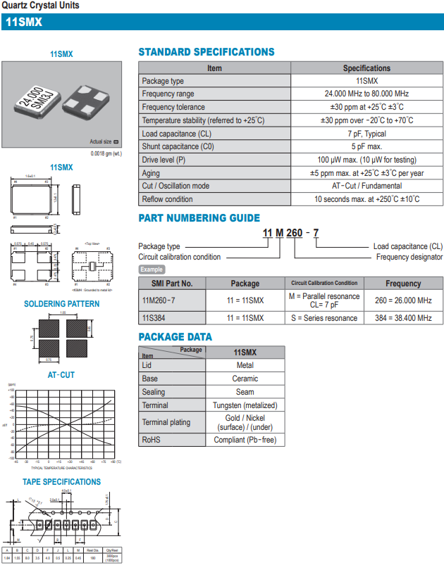 SMI晶振,貼片晶振,11SMX無源晶振.貼片石英晶體,體積小,焊接可采用自動貼片系統(tǒng),產品本身小型,表面貼片晶振,特別適用于有小型化要求的電子數(shù)碼產品市場領域,因產品小型,薄型優(yōu)勢,耐環(huán)境特性,包括耐高溫,耐沖擊性等,在移動通信領域得到了廣泛的應用,晶振產品本身可發(fā)揮優(yōu)良的電氣特性,滿足無鉛焊接的高溫回流溫度曲線要求.