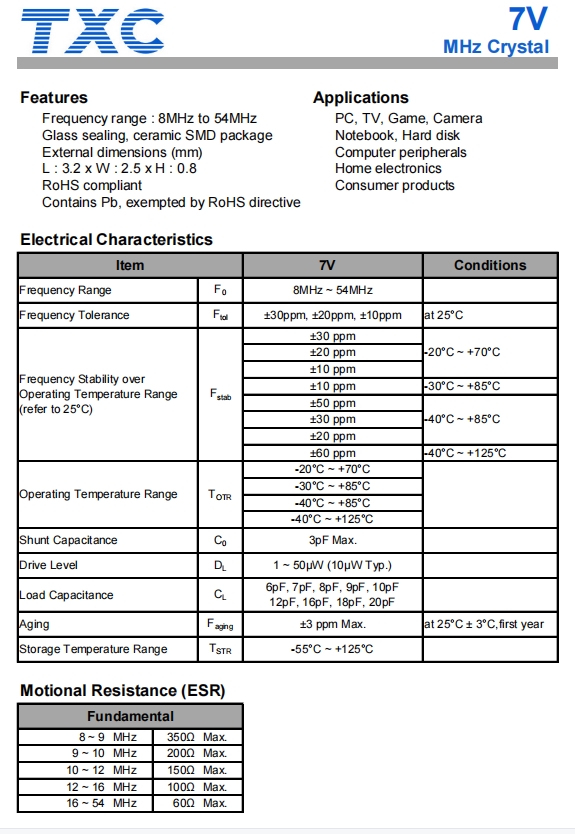 7V-54.000MAAE-T TXC晶振 7V MHz Crystal 54MHz ±30ppm -20°C ~ 70°C