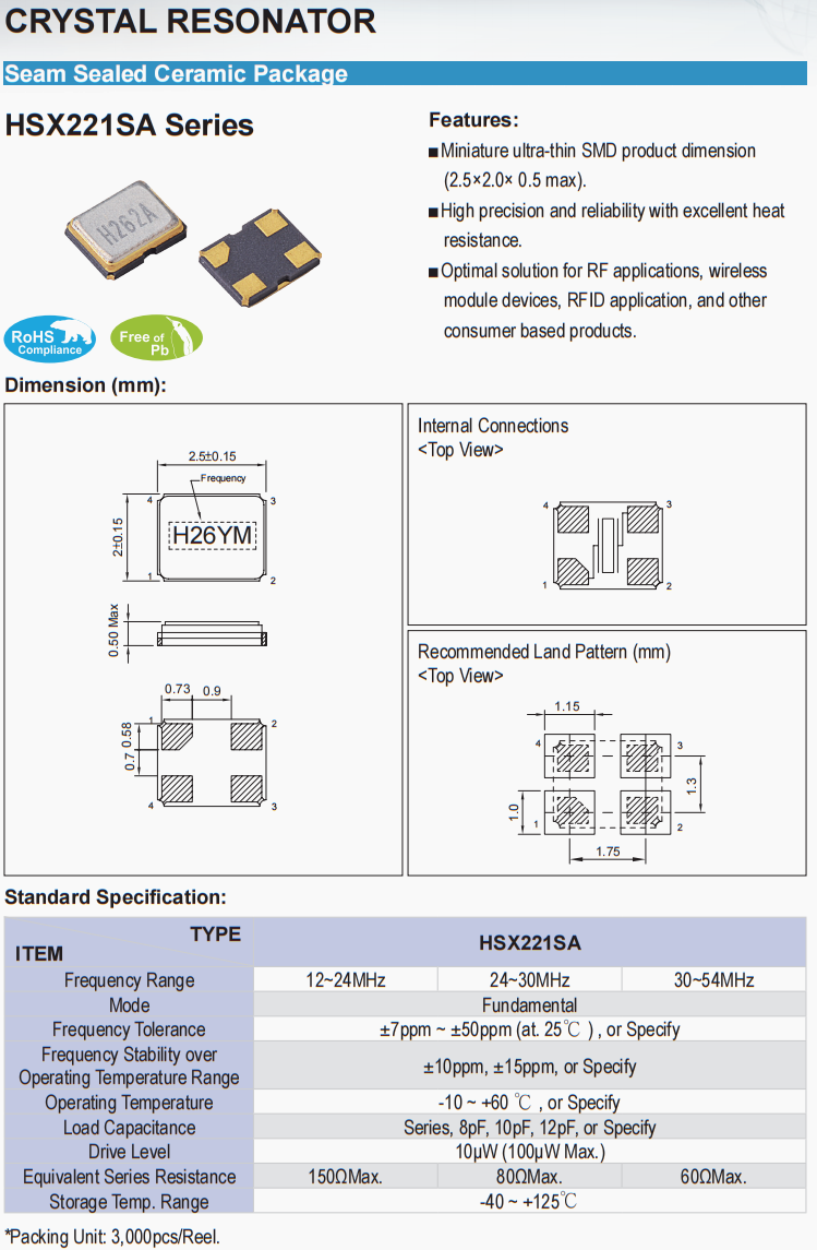 | X2B026000B71HZ-HPR | 加高晶振 | HSX221SA | 26 MHz | ±10ppm | 7.2pF |