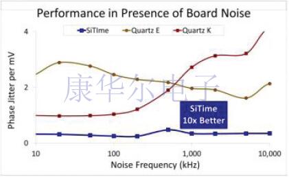 系統(tǒng)中的電源可能是不利于系統(tǒng)性能的主要噪聲源,并且在打開和關(guān)閉電源時會放大此噪聲.大部分噪聲可以通過無源濾波器和去耦電容器濾除.但是,仍然存在一些噪聲,電路板問題(例如接地反彈)會對時鐘抖動產(chǎn)生負(fù)面影響.電源噪聲靈敏度(PSNS)是模擬電路設(shè)計(jì)中使用的參數(shù),它指示電路對電源噪聲的魯棒性.測試結(jié)果表明,SiTime振蕩器的PSNS比石英器件好得多,包括設(shè)計(jì)用于滿足高頻,低抖動要求的石英表面聲波(SAW)振蕩器.