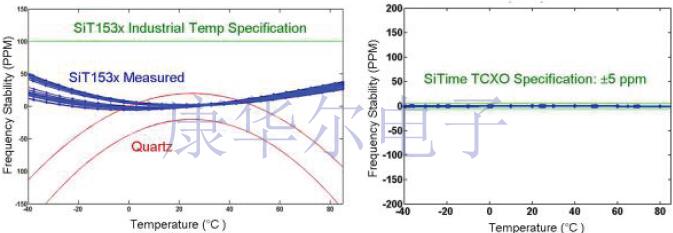 圖4a顯示了基于SiT1532MEMS的32.768kHz振蕩器的頻率穩(wěn)定性與溫度特性曲線.工業(yè)虛線(<100PPMp-p)的SiT1532規(guī)格限制以藍(lán)色虛線表示.紅色曲線顯示了使用基于石英的XTAL音叉類型的32.768kHz振蕩器的典型規(guī)格極限.圖4b顯示了基于SiT1552MEMS的TCXO(溫度補(bǔ)償振蕩器)的頻率穩(wěn)定性,該器件已在多個頻率點(diǎn)上進(jìn)行了出廠校準(zhǔn)(微調(diào)),以確保在整個溫度范圍內(nèi)具有極高的穩(wěn)定性.